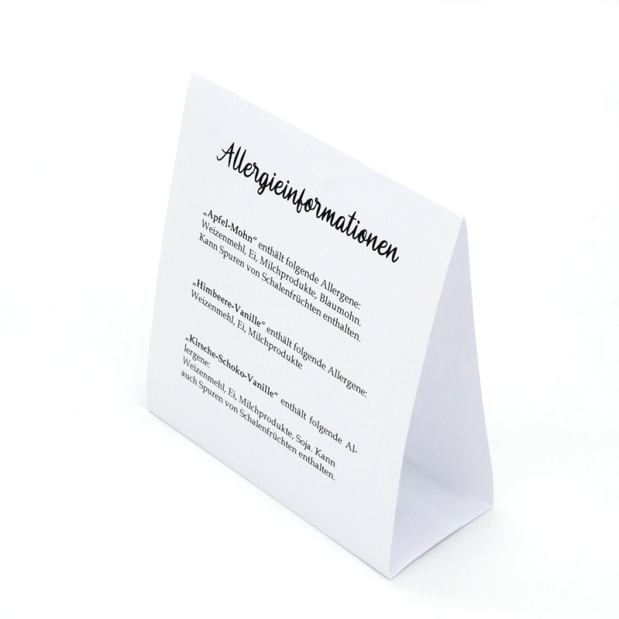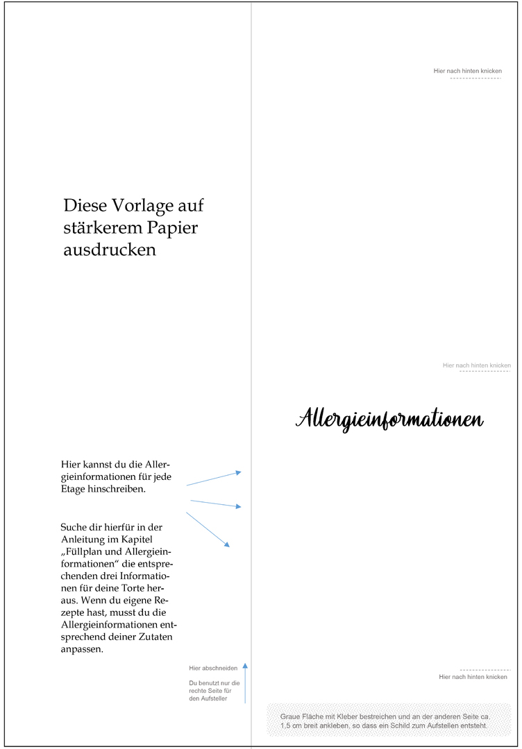 In meinem Buch "Hochzeitstorte backen: so klappt es ohne Stress" habe ich auf einige Formulare und Vorlagen hingewiesen, die dich bei der Herstellung der Hochzeitstorte unterstützen. Wenn du auf das untenstehende PDF-Symbol klickst, kannst du die Bastelvorlage für den Aufsteller Allergieinformationen im DIN A4 Format herunterladen und anschließend ausdrucken.