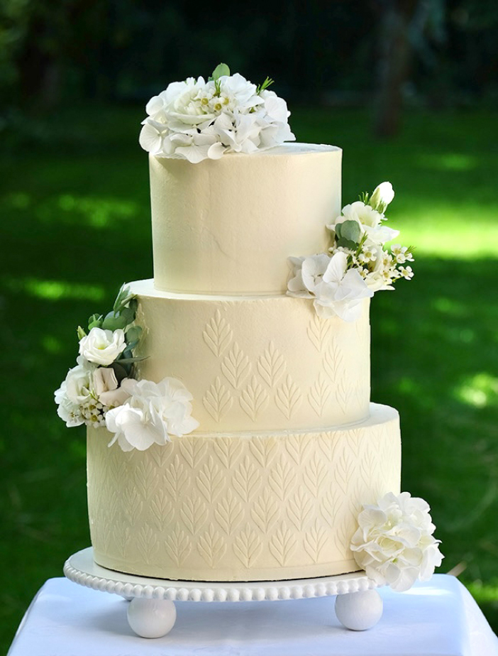 Diese elegante Hochzeitstorte wurde komplett mit einer dünnen Schicht Creme überzogen.