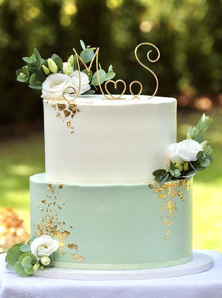 Kleine Hochzeitstorte, zweistöckig, mit frischen Blumen in den Farben grün und weiß.
